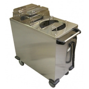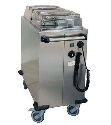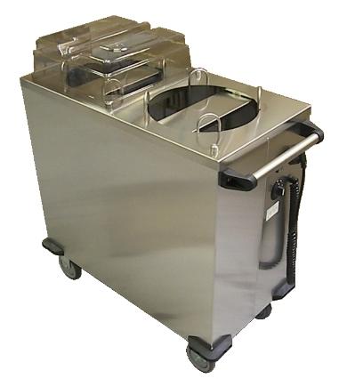 Nerezový transportní a výdejní vozík pro přepravu a podávání talířů. Z chromniklové oceli 18/10. Vyhřívaný. – 4 kolečka s průměrem 125 mm z toho 2 pevná a 2 otočná z toho 1 s brzdou – přívodní kabel 2 m s vidlicí – napájení vozíku 230 V-50 Hz – trubkové madlo – odkládací zásuvka – regulovatelný termostat pro nastavení teploty +30 až +60 °C Rozměry(mm): 975×500×900 Prům. talíře(mm): 220, 250, 270, 320 Kapacita talířů: 100 Počet šachet: 2 Příkon(kW): 1,0 Hmotnost(kg): 40