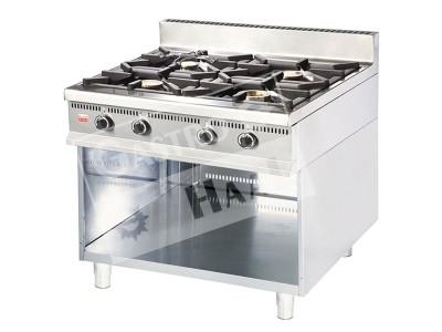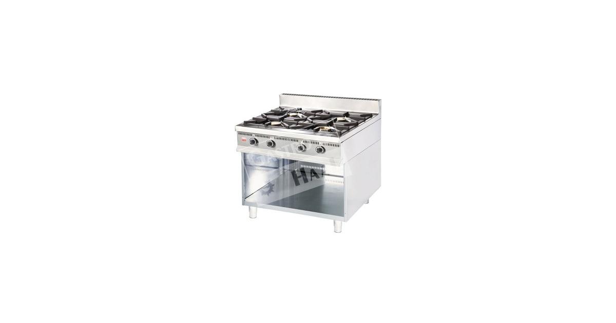 Gastronomický profesionální sporák s plynovými hořáky se používá na vaření v kuchyních jídelen, hotelů, restaurací… Vyrobený s potravinářsky nezávadného nerezového materiálu. Sporák má samonosnou konstrukcí a nastaviteľné nožičky na vyrovnání nerovností podlahy. Čtyři plynové hořáky se zapalují večným plamínkem a jsou vybavené termoelektrickými pojistkami pro bezpečný provoz. Ovládací knoflíky plynových ventilů z thermosetu a mřížky na hořácích z masivní litiny.