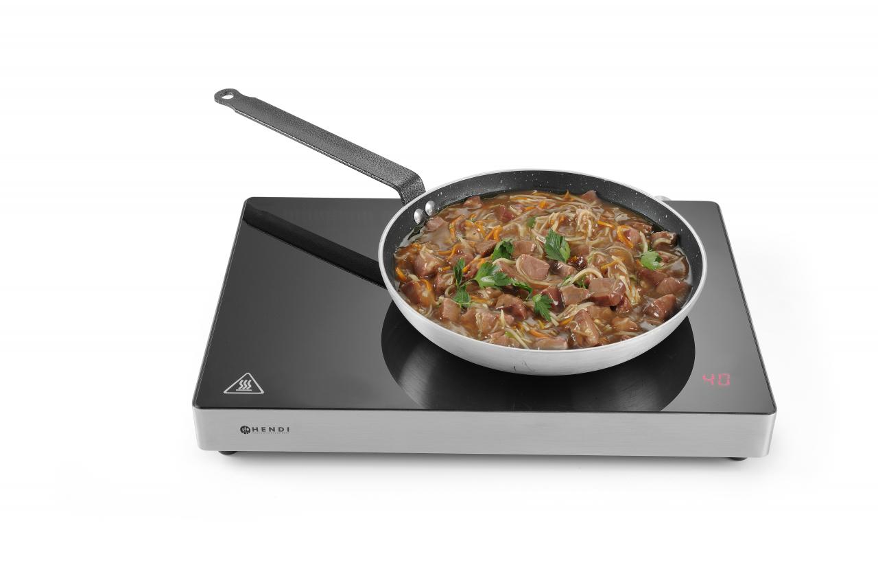 Jedinečná indukční varná deska s obdélníkovou indukční cívkou, která umožňuje zahřívat více pánví současně. Napájení nastavitelné v 11 krocích pomocí knoflíku Teplotní rozsah: 40–100 °C Elektronická ochrana proti přehřátí