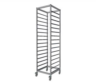 Celonerezové provedení. Počet vsunů dle velikosti GN, plechů, táců, tabletů nebo přání zákazníka. Kolečka pr. 100 mm (2× s brzdou).