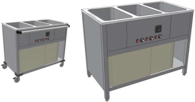 Výdejní stůl (vozík) se používá k přepravě, přihřívání a k výdeji hotových teplých jídel. Ta se do výdejního stolu (vozíku) vkládají v nerezových gastronádobách. Celonerezové provedení, výšková nastavitelnost o 30 mm nebo kolečka o průměru 100 mm (2× s brzdou). Vana a spodní vyhřívaný prostor disponuje samostatným topným tělesem , termostatem pro regulaci teploty až do 90°C a vypouštěcím ventilem. Možnost prokládacího provedení posuvnými dvířky. Ovládání a madlo na delší nebo kratší straně. Provedení na 2× GN, 3× GN nebo 4× GN. Dělící příčky k výdejním vozíkům vanovým jsou dodávány zdarma!