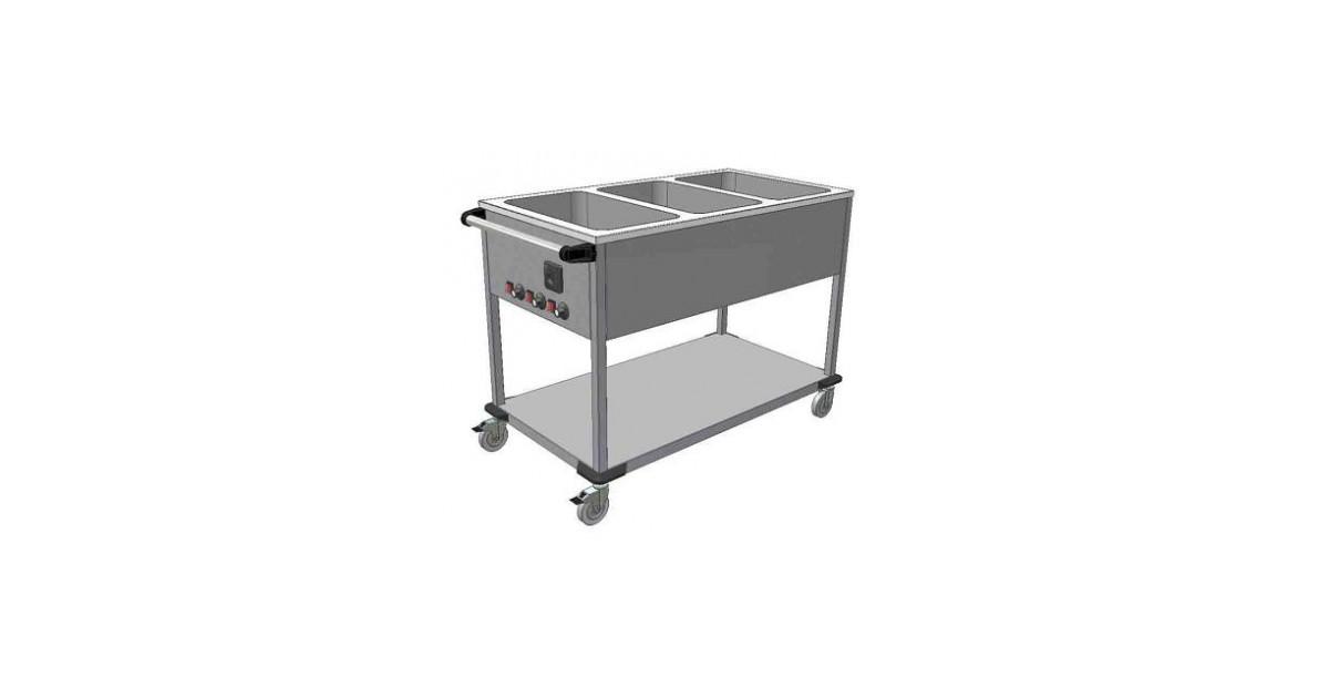 Výdejní vozík s ovládáním na kratší straně se používá k přepravě, přihřívání a k výdeji hotových teplých jídel. Ta se do výdejního vozíku vkládají v nerezových gastronádobách. Celonerezové provedení, kolečka pr. 100 mm (2× s brzdou). Police tl. 40 mm s podélnými výztuhami. Každá vana disponuje samostatným topným tělesem , termostatem pro regulaci teploty až do 90°C a vypouštěcím ventilem.