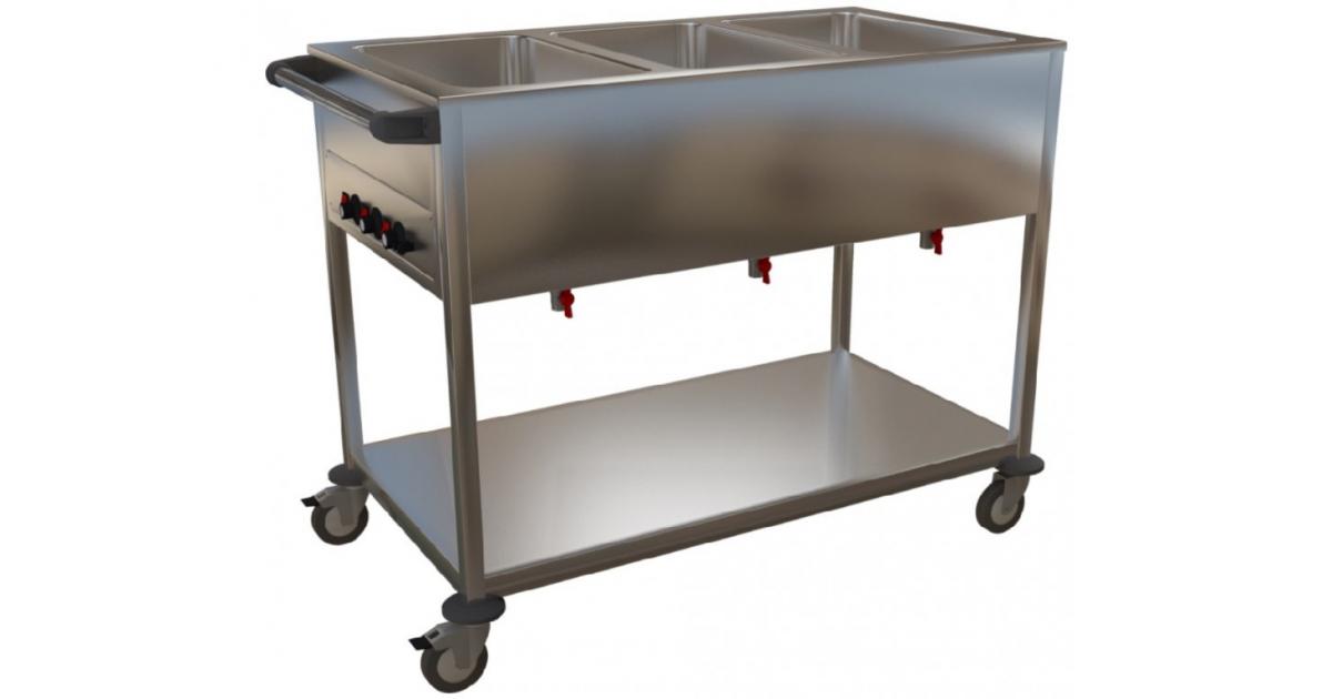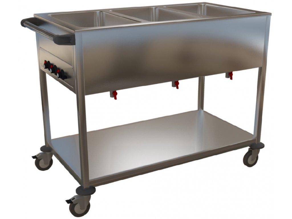 Výdejní vozík se používá k přepravě, přihřívání a k výdeji hotových teplých jídel. Ta se do výdejního vozíku vkládají v nerezových gastronádobách. Celonerezové provedení, kolečka pr. 100 mm (2× s brzdou). Police tl. 40 mm s podélnými výztuhami. Každá vana disponuje samostatným topným tělesem , termostatem pro regulaci teploty až do 90°C a vypouštěcím ventilem.