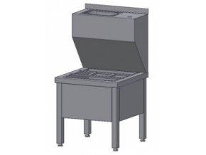 Výlevka je vyrobena z nerez plechu tl. 1,2mm.Prolamovaná pracovnídeska s vevařeným lisovaným dřezem a rámem. V horní části umývátko GN 1/2–150 a otvor pro baterii.