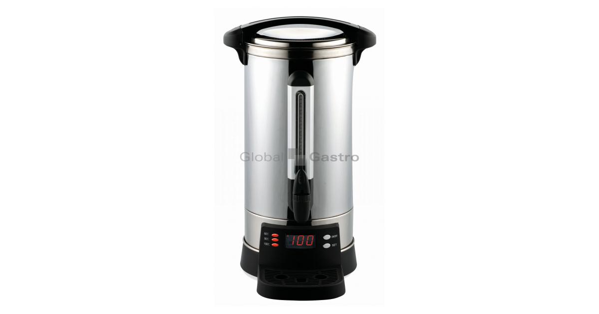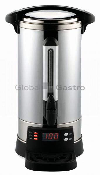 Automatické varné a udržovací termosy na přípravu a udržení horké vody a teplých nápojù. Luxusní celonerezové, dvouplášové, izolované provedení (minimální teplotní ztráty = ekonomický provoz). Automatický systém výroby horké vody, nebo udržení připravených nápojù na požadované teplotě. Výdej nápoje automatickým výpustným kohoutem a množství nápoje v termosu je přehledně indikováno na rysce hladinoměru. Snadné nastavení předvolené varné, udržovací, nebo výdejní teploty na digitálním ovladači (60 / 80 / 100°C), zobrazení aktuální teplotu vody a požadované předvolené teploty na podsvíceném displeji. Nerezové bezpečnostní víko s ergonomickým bezpečným plastovým madlem, odnímatelná odkapávací miska s vyjímatelným roštem pod výdejním kohoutkem.