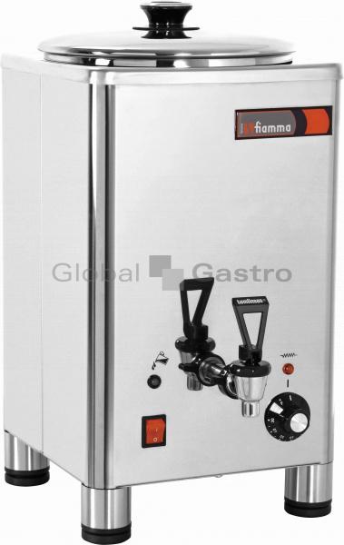 Model je v nerezovém dvouplášťovém provedení “bain-marie”s výkonnou topnicí 1,3 kW, která šetrně ohřívá vodu v plášti, zabraňuje připalování a znehodnocení mléka a dalších nápojů. Uvedený termos je vhodný pro přípravu, udržení a výdej různých druhů nápojů (mléko, vodu, kávu, čaj atd.) Termos je ovládán pomocí regulačního termostatu do 85°C, dále je vybaven kontrolkou chodu a hladiny vody v plášti, anti-kondenzačním systémem, vyjímatelnou vložkou, poklicí a výpustným kohoutem (se snadnou údržbou), centrálním síťovým vypínačem a výškově stavitelnými nohami.