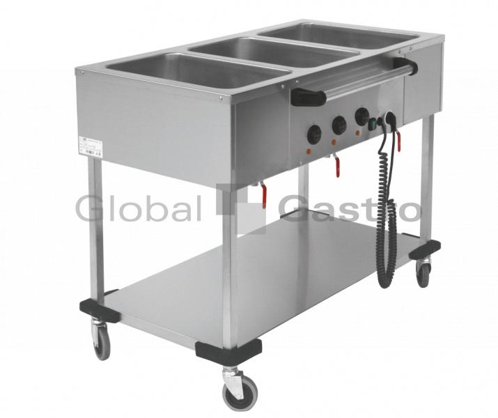 Celonerezový pojízdný výdejní stůl s vyhřívanou vodní lázní,v robustním provedení bez, nebo se spodní policí pevně spojenou s nohami, které jsou osazeny pojezdovými kolečky (2× brzděná).Vrchní deska s jednotlivými lisovaným vanami, každá samostatně regulována a vybavena výpustným ventilem.