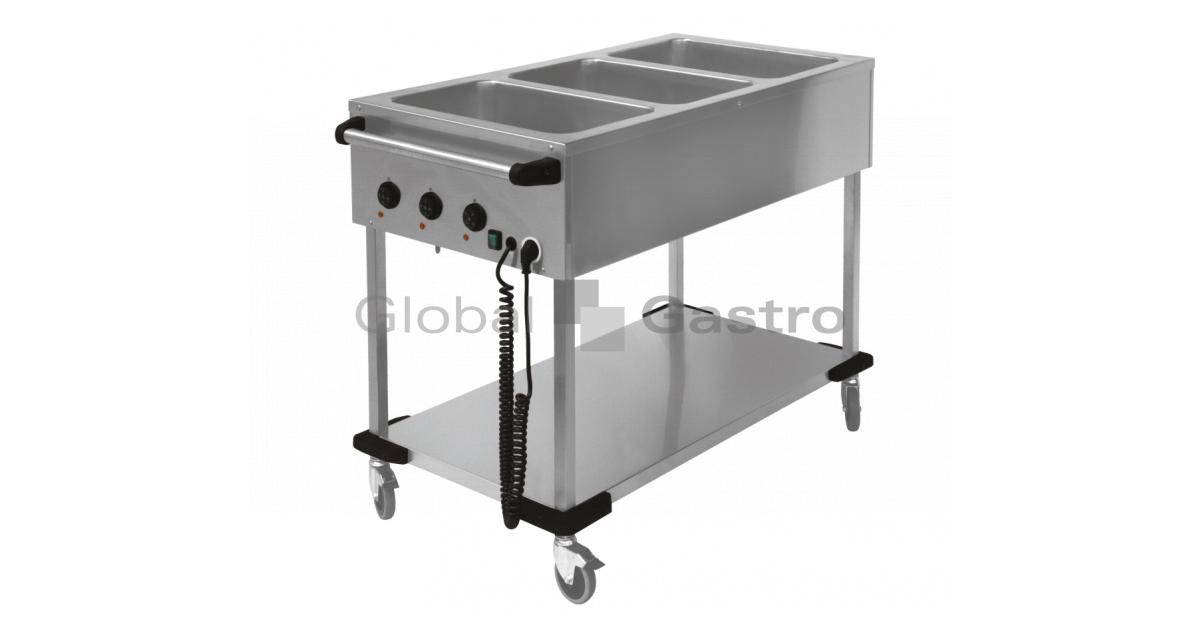 Celonerezový pojízdný výdejní stůl s vyhřívanou vodní lázní,v robustním provedení bez, nebo se spodní policí pevně spojenou s nohami, které jsou osazeny pojezdovými kolečky (2× brzděná).Vrchní deska s jednotlivými lisovaným vanami, každá samostatně regulována a vybavena výpustným ventilem.