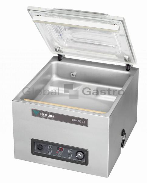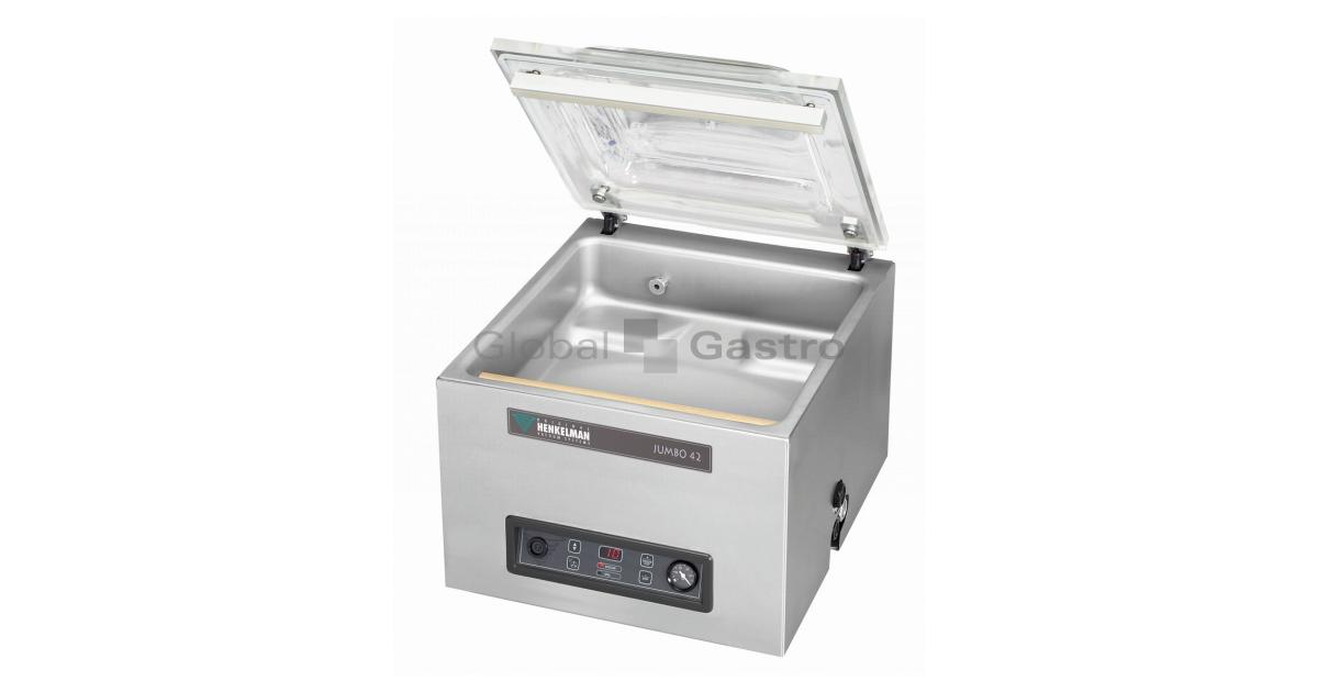 Prodlužte trvanlivost masa, drůbeže, ryb, sýrů, zeleniny a dalších potravin včetně tekutin. Ochraňte je před působením vnějších vlivů. S výkonnou, profesionální a spolehlivou jednokomorovou vakuovou baličkou Jumbo 42 od holandské firmy Henkelman to půjde snadno. Vakuová komora se zaoblenými rohy má délku komory 370 mm, šířku lišty (max. šířka sáčku) 420 mm a výšku komory 180 mm a dokonale uchová trvanlivost produktů.