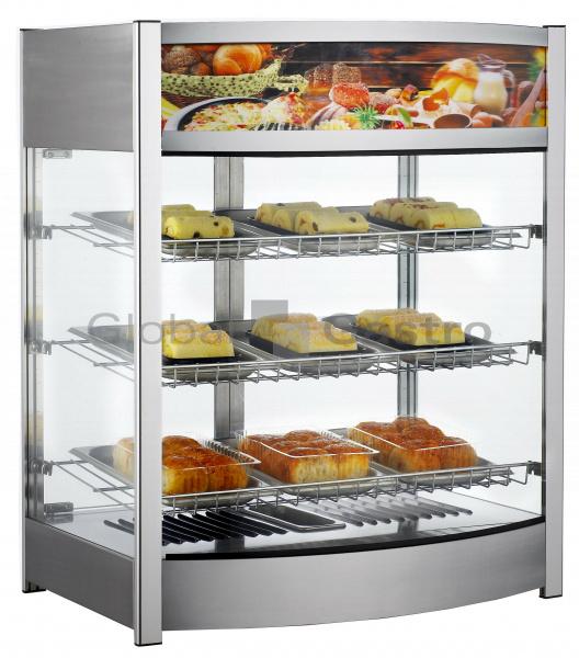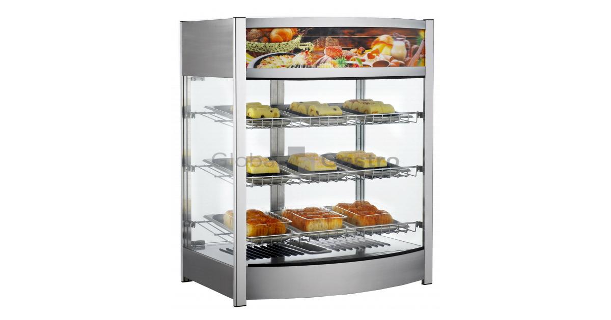 Vyhřívaná panoramatická vitrína s volitelným uložením roštových polic pro prezentaci pokrmů (výškově stavitelné). Vitrína je v elegantním nerezovém provedení, ze všech stran prosklená s osvětlením, které napomáhá prezentaci potravin. Křídlové dveře ze strany obsluhy. Vitrína je ovládána mechanickým termostatem (30~60°C), vypínač osvětlení a ohřevu, ohřev statický s miskou na mechanické přivlhčení v komoře.