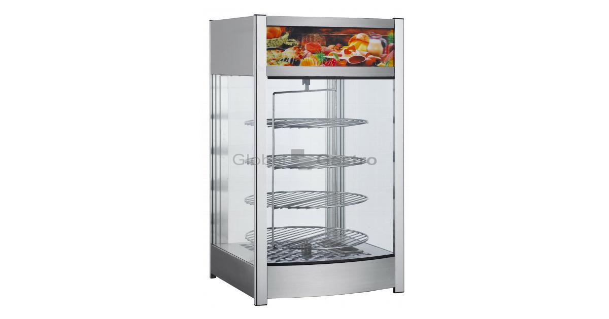 Vyhřívaná panoramatická vitrína s rotační prezentací pokrmů. Vitrína v elegantním nerezovém/chromovém provedení, elegantní horní reklamní panel, prosklená ze všech stran, vnitřní osvětlení, které napomáhá prezentaci a prodeji potravin ve všech patrech. Křídlové dveře ze strany obsluhy. Vitrína je ovládána mechanickým termostatem (30~60°C). Kulaté roštové police v chromovém provedení.