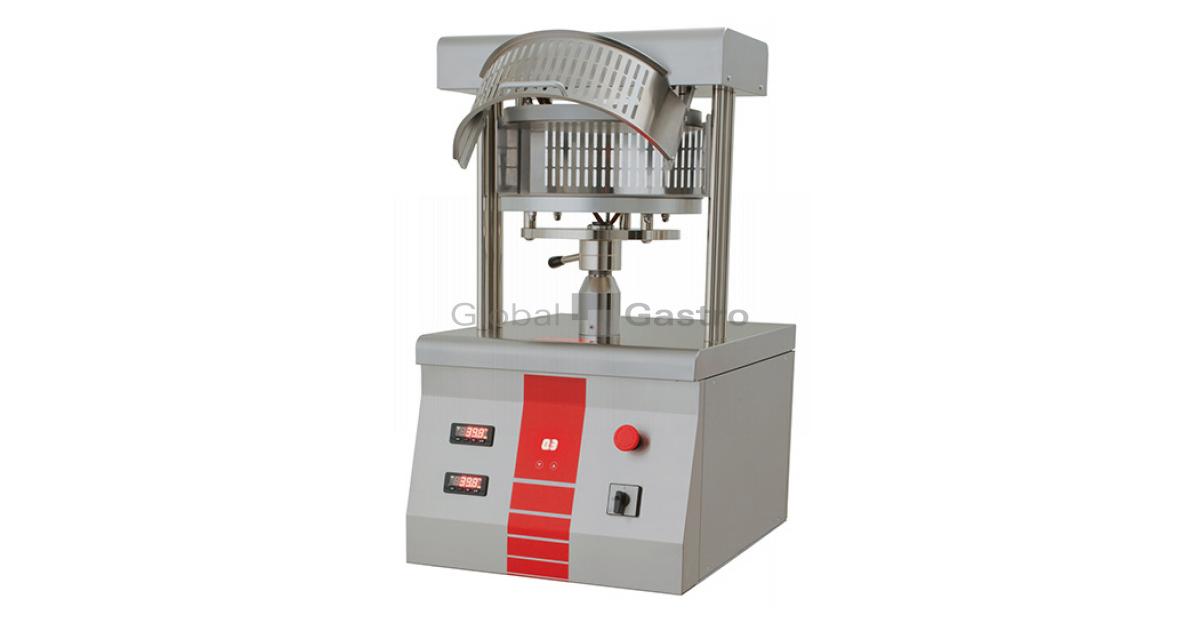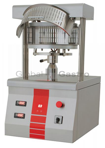 Mechanický lis na pizza těsto s nezávislým nastavením teploty pomocí dvou termostatů do max 150°C. Velikost porcí je PF45 250–500g, (PF50 300–700g).
