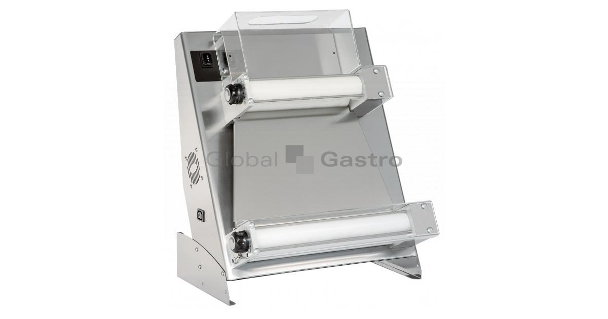 Vyvalovací lisy na těto. Model je komplet v robustním celonerezovém provedení, 2 páry polohovatelných plastových lisovacích válců uložených paralerně nad sebou, bez tvarovacího zařízení vhodné pro větší hmotnosti, hranatý a delší tvar těsta.