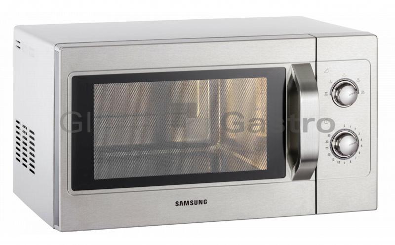 Parametry Výrobce Samsung Napájení 230 V Příkon 1450 W Šířka 517 mm Hloubka 412 mm Výška 297 mm Provedení celonerezové Hmotnost 17,5 kg Rozměr komory 336×349×225 mm Časovač ano Digitální display (čas a hlášení) ne Frekvence 2430 MHz Mikrovlnný příkon 1100 W Možnost nastavení programů ne Nerezové vnější / vnitřní provedení ano Objem 26 litrů Ovládání mechanické Počet magnetronů 1 Počet stupňů mikrovlnového výkonu 5 Tlačítko přidání času ohřevu ne Signalizace ukončení procesu ano Odnímatelný strop ne Tlačítko dvojnásobné množství ne Vniřní prostor nerez (keramické dno) Vnitřní prostor vhodný pro GN 1/2 Vyjímatelný vzduchový filtr (nerez) ne
