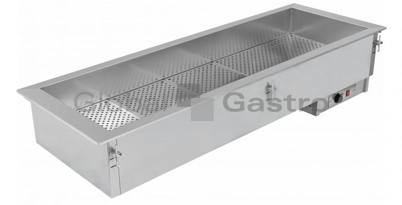 Vestavná teplá udržovací vana ASBER DDBM – statický suchý sálavý ohřev v celonerezovém provedení s mechanickým termostatem a regulací (30°až 90°C) s centrálním vypínačem. Nedělená vana s hloubkou 160 mm vhodná pro GN1/1 s hloubkou max. 150 mm. Vana je opatřena perforovanými vložkami a polohovatelnými kotvícími prvky, které společně s lemem vany zajišťují přilnavost k pracovní desce po celé ploše.