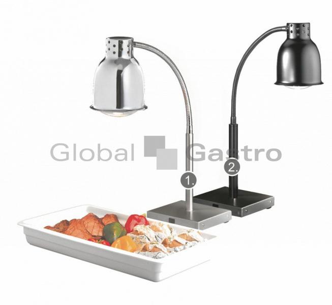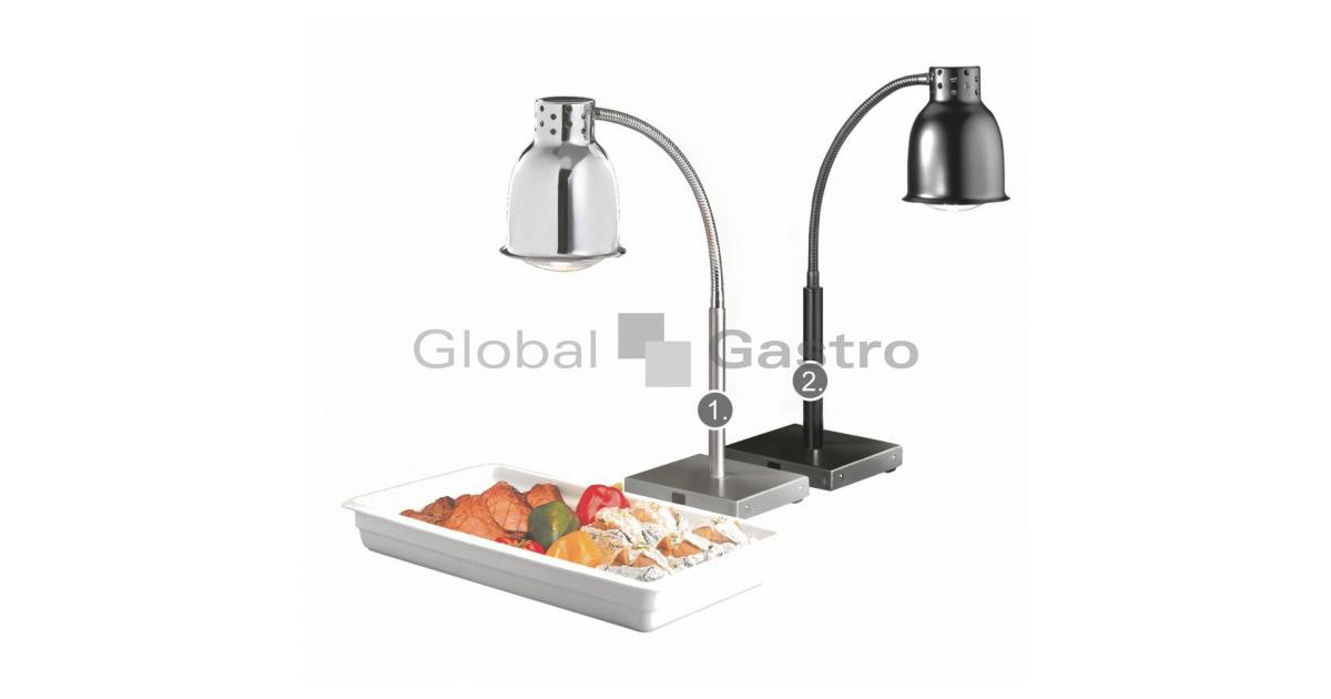 Stolní lampa v provedení chrom. Ideální do prodejních prostor. S infra lampou nasvítíte pokrmy a udržíte je déle teplé. Atraktivní vzhled nasvícených produktů, ideální pro přímý prodej pokrmů TO-GO jako například pizza, masové pokrmy nebo i pasta.