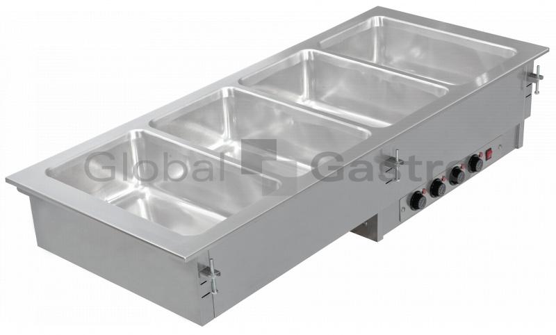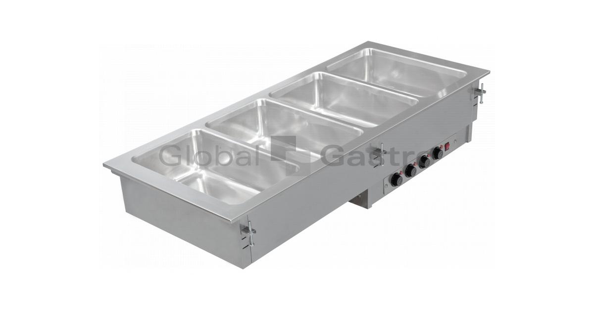 - Vestavná vodní lázeň – dělená je speciálně navržena pro uchovávání, prezentaci a distribuci teplých potravin uložených v hlubokých nerezových GN (dodávány volitelně).
