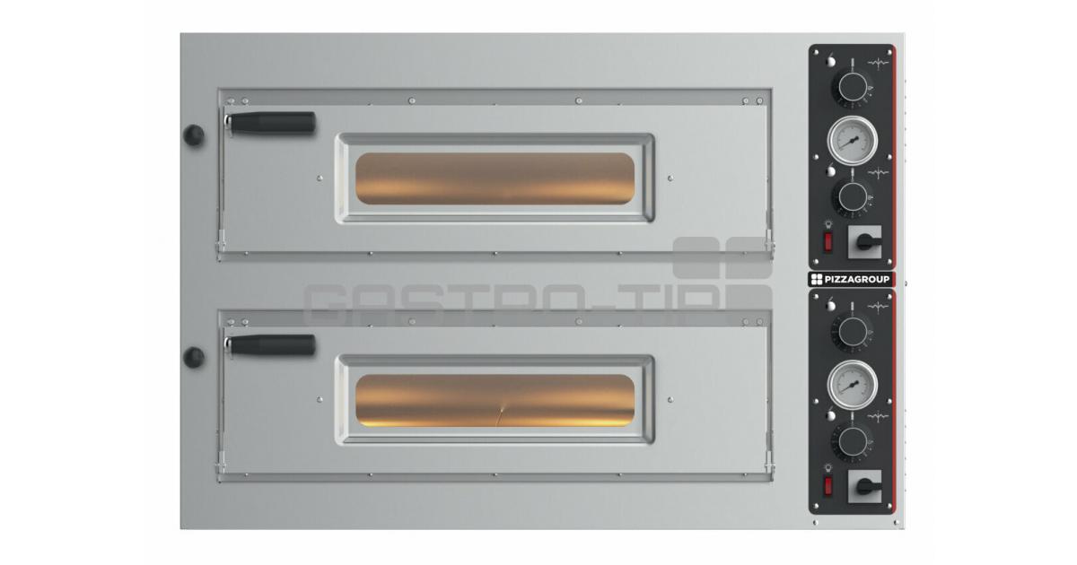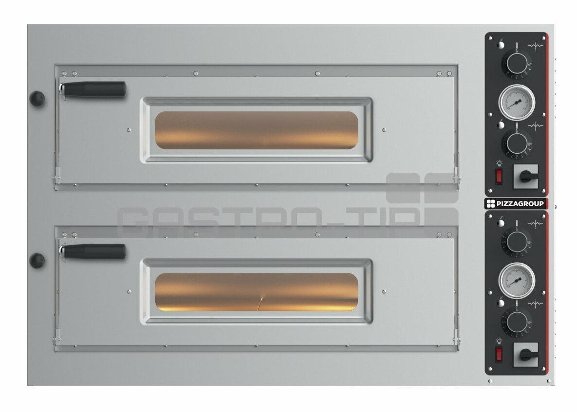 Parametry Značka: PIZZA GROUP s.r.l. Napájení: 400 V Příkon: 11,2 kW Šířka: 990 mm Hloubka: 920 mm Výška: 680 mm Příkon těles spodních: 2 × 2 800 W Příkon těles horních: 2 × 2 800 W Hmotnost: 149 kg Ovládání: elektromechanické Plné dveře: ne Počet komor: 2 Pizza průměr: 2×4 – Ø30/34 Prosklené dveře: ano Provedení komory: šamotové dno Regulace teploty: do 450 °C Rozměr komory: 700 × 700 × 150 mm Teploměr: 2× analogový Vnitřní osvětlení: ano