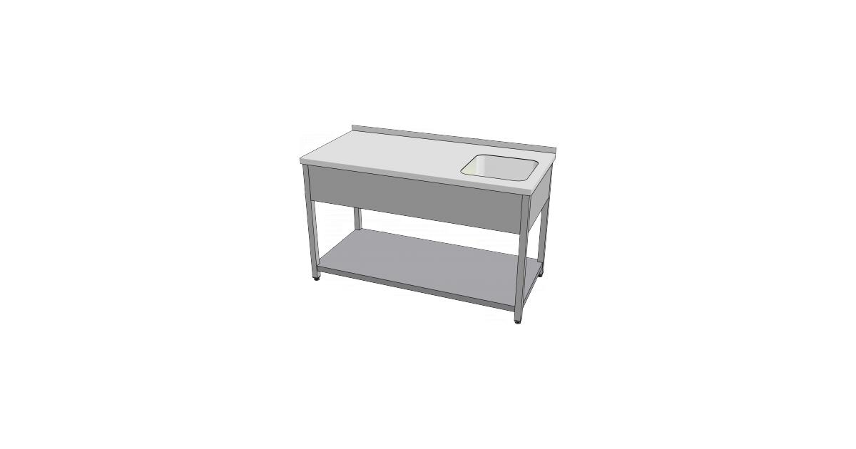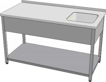 Pracovní desku tvoří nerez plech tl.1,2 mm podlepený dřevotřískou, která je chráněna zdravotně nezávadným nátěrem. Provedení bez lemů, zadní nebo boční lemy výšky 40 mm. Tl. pracovní desky a police 40 mm. Maximální délka stolu 2850 mm (6 nohou). Světlost police s podélnými výztuhami 105 mm. Umístění dřezu dle požadavků zákazníka.