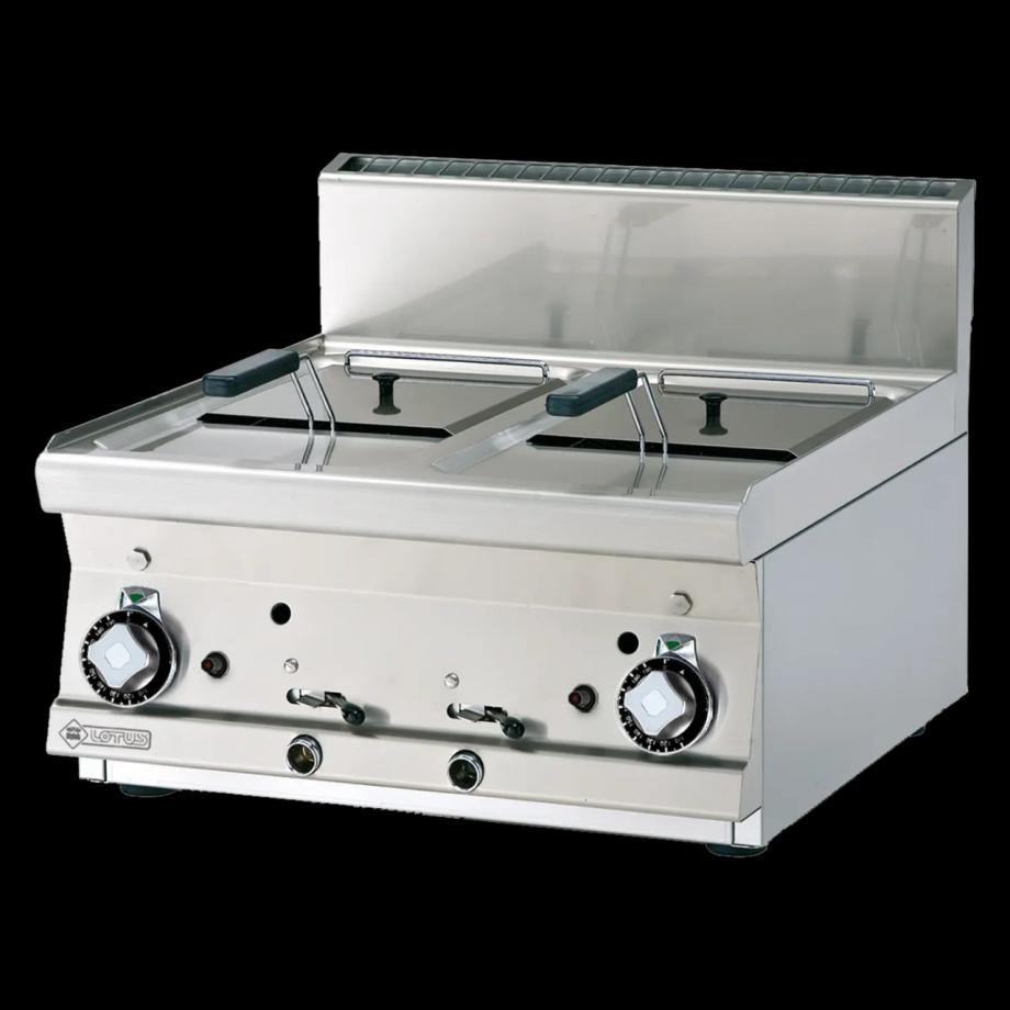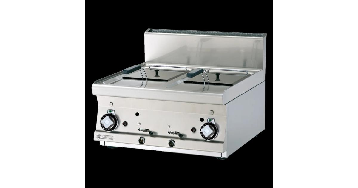 Objem vany [l]: 8 Typ výpusti: Na čelní panel Výpusť: Ano Výpust s bezpečnostní pojistkou: Ano Maximální teplota zařízení [°C]: 50 Minimální teplota zařízení [°C]: 190 Materiál: AISI 304 vrchní deska, AISI 430 opláštění Umístění ohřevu: Vnitřní Zapalování: Piezo+večný plamen Počet košů: 2 Rozměr košů [mm x mm x mm]: 200 × 240 × 90